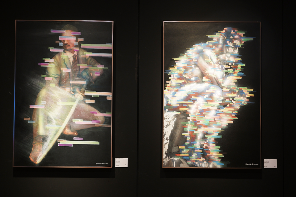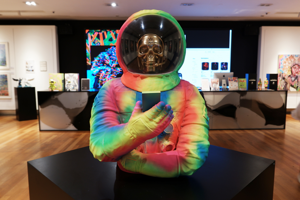 是次展覽以彩色和黑色對立,營造出強烈的對比感,除了有Jimmy 鍾情的武士、忍者和傳統文化藝術等元素為主角,其中掛在近門口位置的新品也是焦點之一 —— 如載著金魚的太空人模樣,寓意現時NFT 盛行,無論任何人都爭著搶購,但到底其實大家又是否知道自己正在買甚麼;另一幅以墨西哥著名的Cave of Crystals為靈感 —— 水晶代表著永恆,保留數千、數萬年還是歷久不衰,同樣地藝術作品也是能抵抗歲月年輪的洗禮,永恆不變。