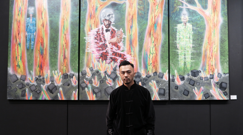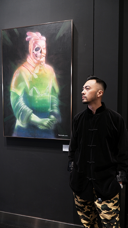 再步入場內,可以欣賞到更多「窒機」畫作,在那黑色背景、炫彩之中,有著一條條的格仔橫紋,使它儘管只是靜止的,也會讓人腦裡產生那種「窒機」效果。令人更驚喜的是,Jimmy 最著名的Black Piece《黑俑》今次亦被賦予上色彩,然而他向來的作品都有著隱藏的意思,這不禁讓筆者好奇填上顏色的黑俑,又是否帶著另一種的審視?Jimmy 直言是經過消化後的想法,「黑色背後本身是演繹了一種力量,但因為今次的主題是有關戰爭與和平,所以為了反映出這個年代的Pattern,就會展現出另一種形態。」Jimmy 又強調他的師傅梁一川曾提過,筆墨隨時代,我們需要隨著時代而創作,同時把當下紀錄,故此作品都需要隨時代轉變。