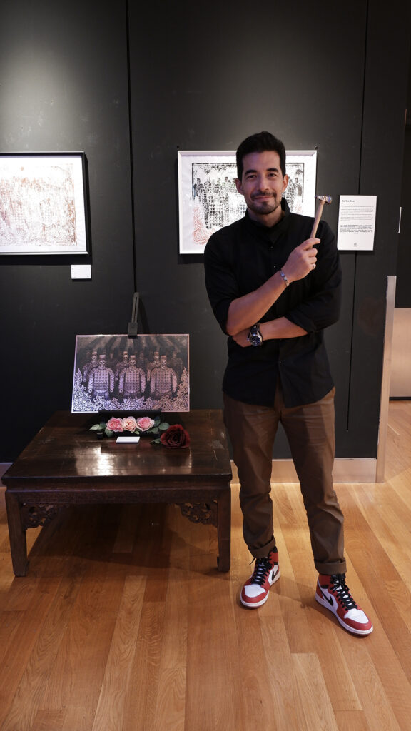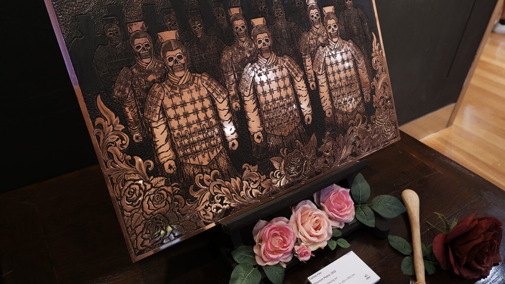 其後Carlos 開始幫本地其他同好者製作金屬雕刻,偶爾的機會下Jimmy 得悉他雕刻了一個骷髏骨的零件,瞬間一拍即合,促使這次的合作,而Carlos 非常特別地採用了骷髏骨組成的兵馬俑,代表著古代黑暗的地下戰爭,並利用紅銅營造出柔和的感覺,而底部則是象徵著愛與和平的玫瑰花及唐草花,打造出「Phantom Peace」這幅作品。恰巧地在展出時配上射燈效果,卻予筆者有種可怕感,彷彿是邁向死亡,與「和平」的主題大相逕庭,然而Carlos有另一種看法,他認為和平是一個相對的概念,需要有戰爭、衝突,才能突顯其可貴,「當你很Peaceful 地坐地鐵,突然有兩個人在打架,你會覺得有衝突,可能會想離開,所以和平其實是相對的,需要用衝突帶出。」Carlos又解釋紅銅在燈光照射下,遠看似是火光,在發光發熱,所以當兵馬俑接近火堆並吸收光和暖,如同是經歷過寒冷、死亡、溫暖,最終才會帶出和平。