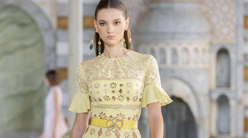 運用Pastel Yellow 的蕾絲布料以及花形、菱形的鏤空布料做車縫,增加層次感;而在手袖及裙擺部分均有皺褶效果,可以透過走路時擺動,加強陽光和活力感,再配搭一條鮮黃色的腰帶並繫有銀色的蘭花扣,這能修飾腰部曲線之外,更能襯托Pastel Yellow,同時蘭花扣亦呼應今季以Orchidée Précieuse 的主題。