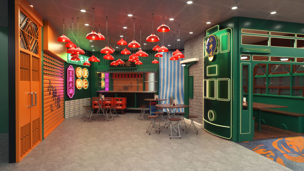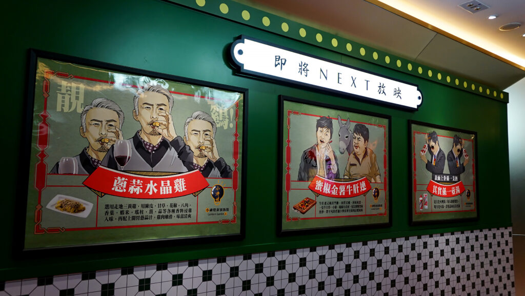 在介紹食物前,除了菜式可以「相機先食」,其裝潢也是打卡熱點——配搭五、六十年代常見的綠鐵皮攤檔、街市紅色吊燈以及霓虹燈招牌,不禁喚醒大家對舊香港的情懷;還有電車作為卡位,一路吃飯一路感受香港獨有且歷史悠久的「交通工具」。當然說到地道還有陪著港人長大的港產片,其中的台詞更成為我們日常對白,所以飯館為感謝香港電影曾帶來的快樂,同時又可做到宣傳港產片的效果,特意請專人繪畫插畫再與菜式作連結,將5套經典電影呈現給大家。