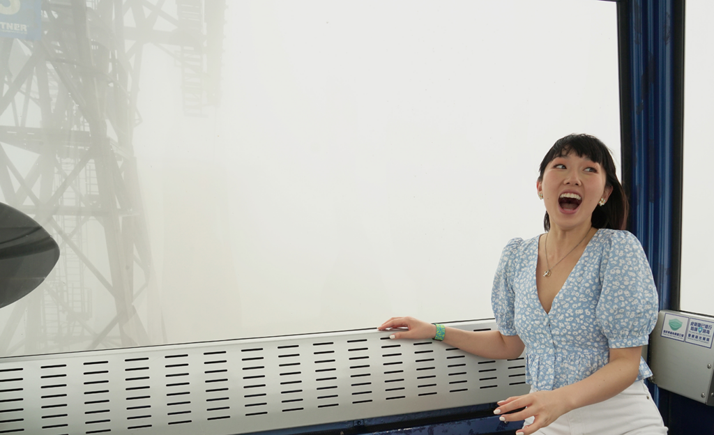要前往昂坪的方法不少,然而最標誌性的非坐昂坪360 莫屬。昂坪纜車曾多次被譽為「世界十大最佳纜車體驗」之一,而Leanne 乘搭的水晶纜車,四面都是透明車廂,可以360 度飽覽自然風景與山郊景觀,更可遠眺赤臘角機場停機坪。看著腳下連綿起伏的山峰、廣闊無垠的海洋,讓人有種在天空翱翔的感覺,十分寫意,亦可以在此與友人拍照留念。雖然適逢拍攝當日下起大雨又有大霧,當纜車駛至高處,四周更是被白霧環繞,全部視線被遮擋,像是墮進五里霧中!不過聽著耳邊風聲呼呼作響,纜車不時被吹得左右搖晃,Leanne卻是十分享受,笑言有一種探險的感覺,猶如在遊樂場玩過山車,別有一番風味。