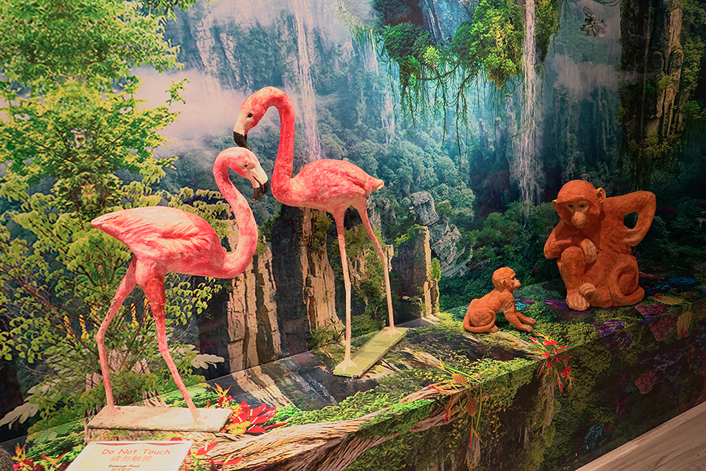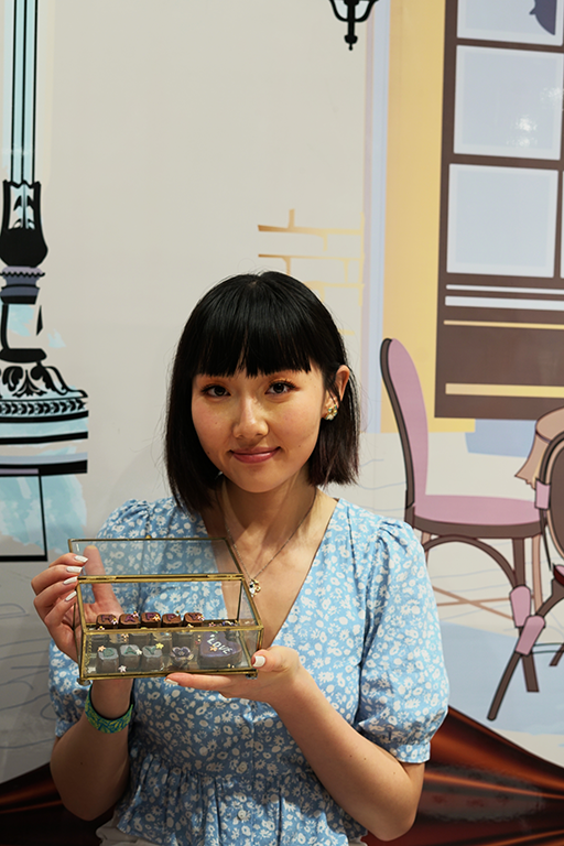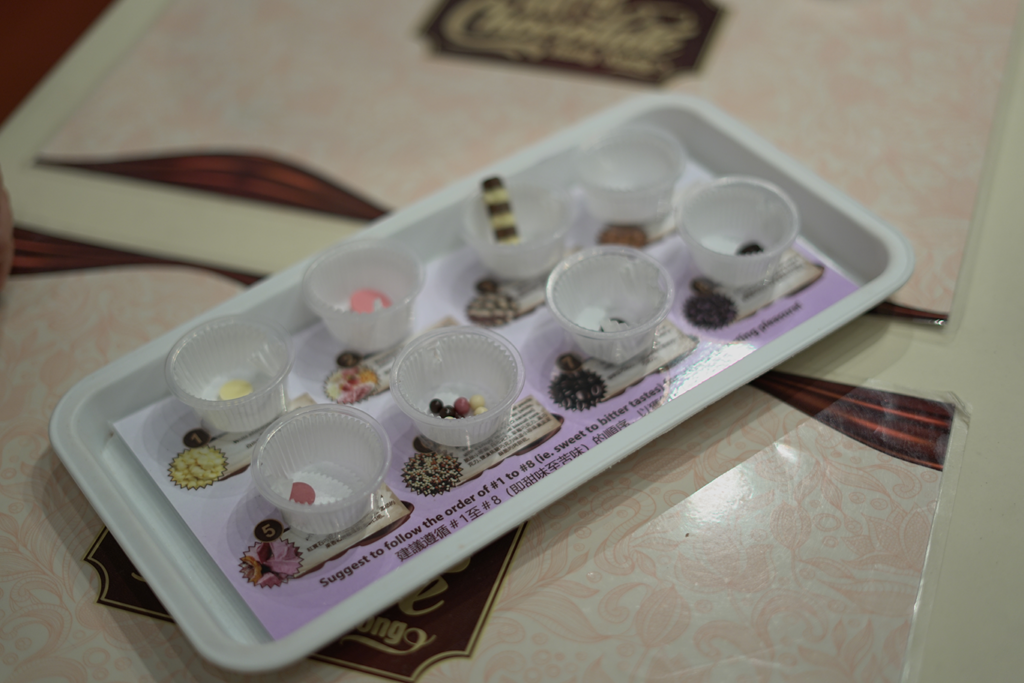 昂坪市集同時設有不少有趣好玩的特色展覽,如以巧克力為主題的巧克力藝術坊,場景充滿香港特色,內設用巧克力打造的茶樓點心、麻雀、金器、刺繡鞋等共388 件巧克力展品,總共耗費2800 公斤的巧克力,每一件展品都栩栩如生,Leanne都不禁驚嘆巧克力大師的鬼斧神工,「真的太像了,我一開始以為都是真品,沒想到是巧克力。」同場設有DIY 工作坊,大家可以親手製作一款專屬的巧克力藝術品。另外,亦可以品嘗多達8 款的原生巧克力,負責人Kelly 指巧克力按甜味由1 至8 號排序:1 號最甜,8 號最苦,1 至4 號味道較甜,適合小朋友;4 至8 號則較受成人歡迎。Leanne 最喜歡7號咖啡巧克力,「它不會太甜,帶有濃郁的咖啡味,味道剛剛好,有點摩卡咖啡的味道。」