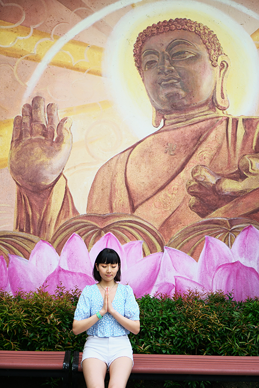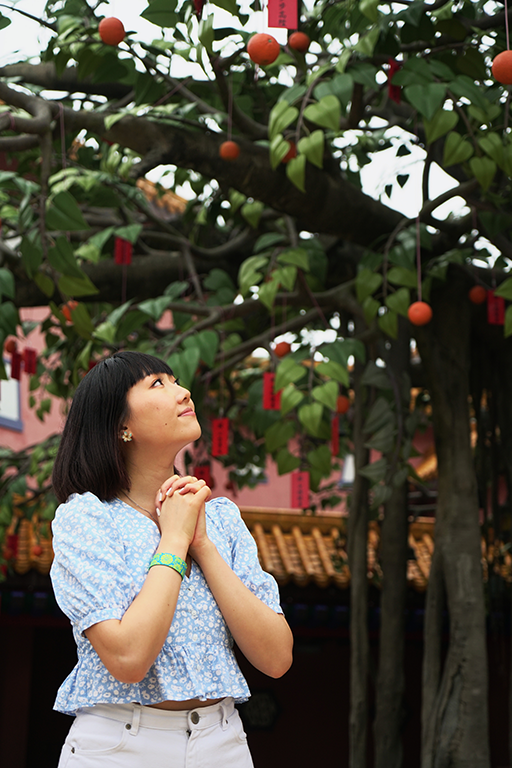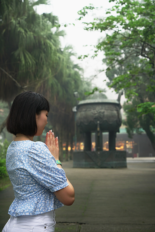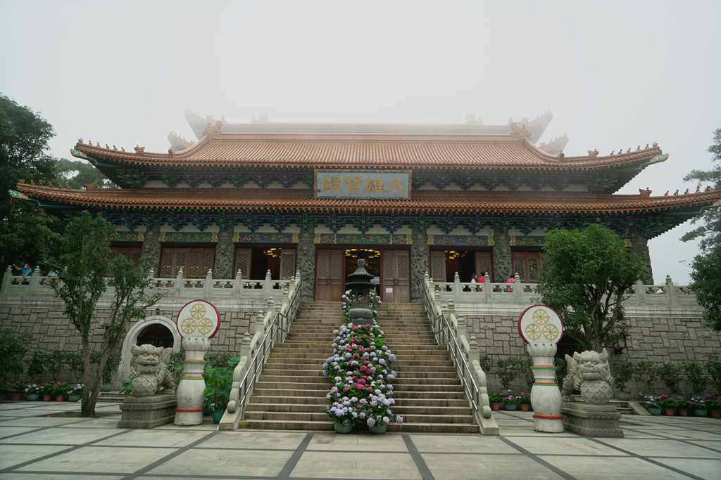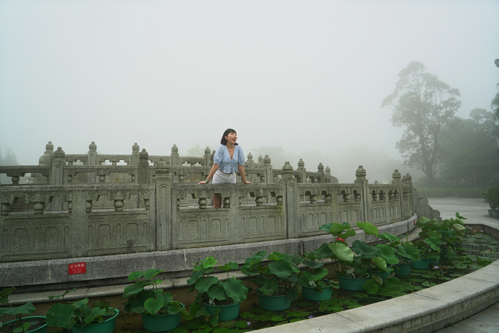 另外在天壇大佛維修期間,其實附近的寺廟仍是如常開放,信眾可繼續前來參拜納福,Leanne 便趁機參觀了大佛附近的寶蓮禪寺。寶蓮禪寺坐落昂坪高原,面朝天壇大佛,前稱為大茅蓬,始建於1906 年,於1924 年正名為寶蓮禪寺。它不單是大嶼山著名的景點,更是世界名剎之一,以多項壯麗建築聞名中外。寶蓮禪寺的主建築格局講究,在中軸線上,山門、韋馱殿、大雄寶殿、萬佛殿依次沿地勢而上,兩旁則有對稱的鐘樓鼓樓、禪堂、齋堂和僧堂,與院落空間形成了一個序列。拍攝當日,有不少善眾前來上香,Leanne亦虔誠地入廟參拜,祈求佛祖保佑。